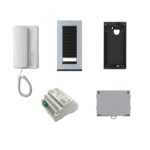 Kit videocitofonico monofamiliare 8K40CF-019, espandibile fino a 4 chiamate, composto da video citofono AGT, targa esterna LITHOS e alimentatore VAS/101. |