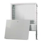 Cassetta d’ispezione in metallo zincato, telaio e coperchio verniciato colore bianco per l’alloggiamento dei collettori per impianti radianti. |