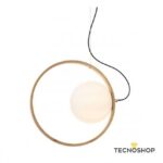 Sospensione per interni, struttura in metallo verniciato oro opaco e legno fibra naturale, diffusore in vetro soffiato bianco opale. |