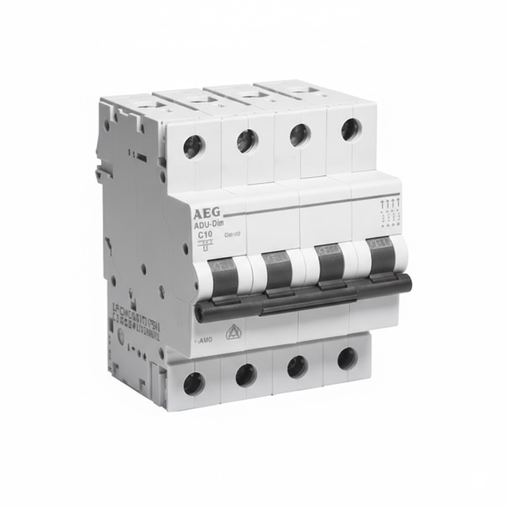 Il dispositivo è un interruttore modulare AEG a 4 poli con corrente nominale di 6 A e potere di cortocircuito 6 kA, dotato di curva di intervento C (5–10 In). Supporta tensioni AC fino a 400 V e DC fino a 110 V (2 poli in serie), con capacità di rottura Icu 10 kA e capacità di servizio Ics 75%.