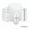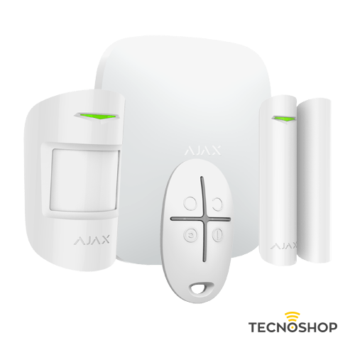 Sistema di allarma anti-intrusione professionale AJAX con comunicazione senza fili bidirezionale, composto da: pannello di controllo Ajax Hub AJ-HUB-W, un contatto magnetico AJ-DOORPROTECT-W, un rilevatore di movimento AJ-MOTIONPROTECT-W e un telecomando AJ-SPACECONTROL-W.