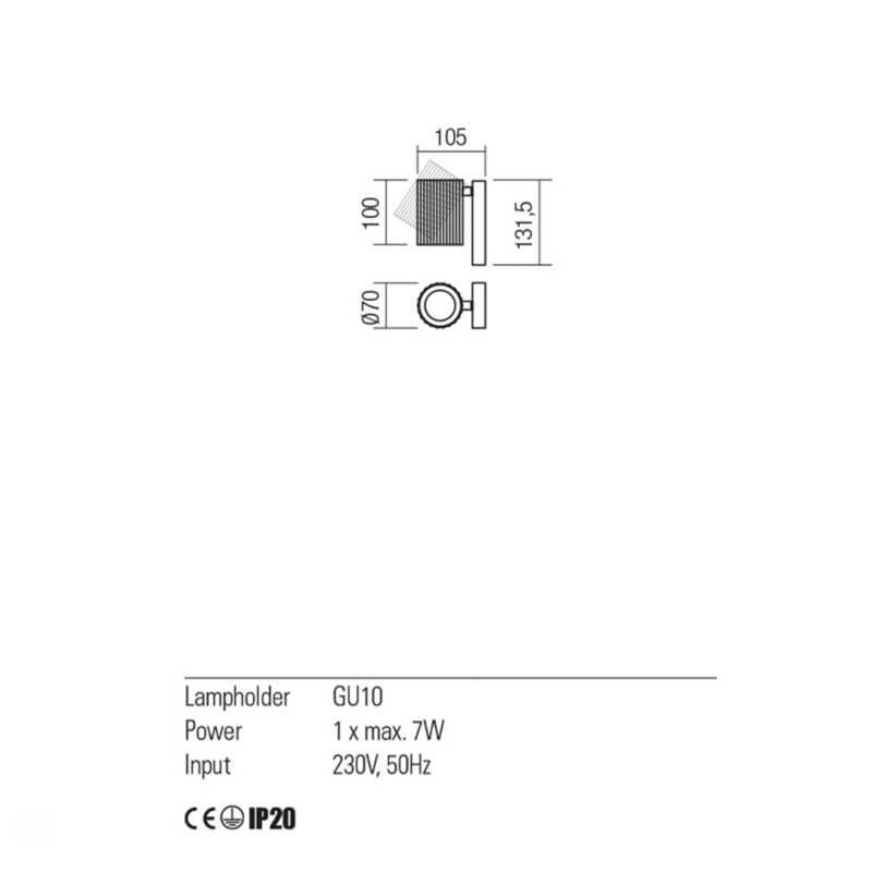 - Dimensioni: Diametro: 70mm, Lunghezza paralume: 100mm, Altezza: 131,5mm, Distanza dal muro: 105mm
