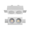 Faretto da incasso fisso con struttura in gesso, forma quadrata ad incasso e riflettori tondi, per due lampadine LED, attacco GU10 o moduli LED CM03. Posizione retratta delle lampadine per evitare l’abbagliamento diretto. Viene montato in controsoffitti in cartongesso, con il profilo senza cornice a vista.