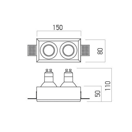 Faretto da incasso fisso con struttura in gesso, forma quadrata ad incasso e riflettori tondi, per due lampadine LED, attacco GU10 o moduli LED CM03. Posizione retratta delle lampadine per evitare l’abbagliamento diretto. Viene montato in controsoffitti in cartongesso, con il profilo senza cornice a vista.