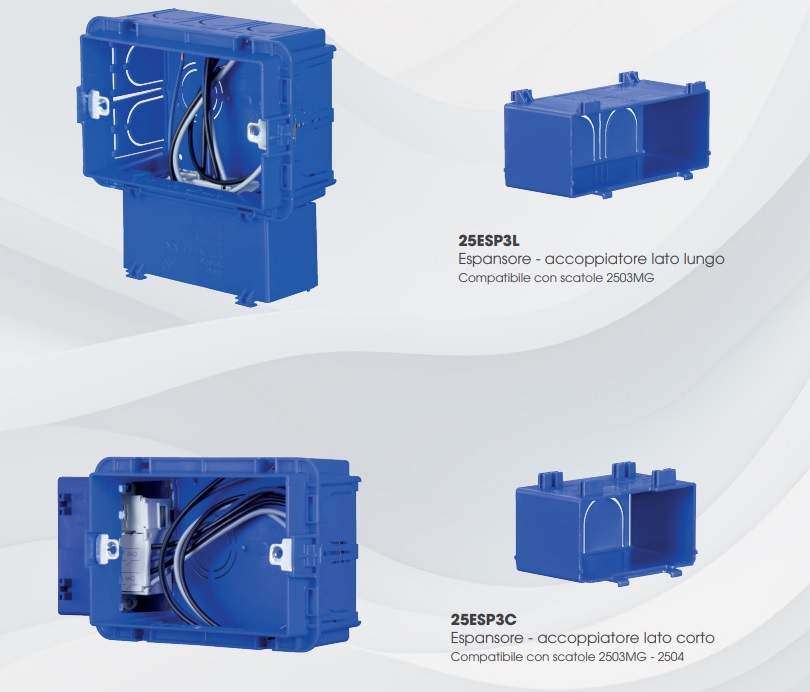 Espansore – accoppiatore lato corto per scatole porta frutti in muratura 3 moduli. Compatibile con scatole 2503MG – 2504. L’accessorio permette di accoppiare le due scatole tramite il lato corto rendendo uniforme la distanza tra di loro e permettendo il passaggio cavi da una scatola all’altra.