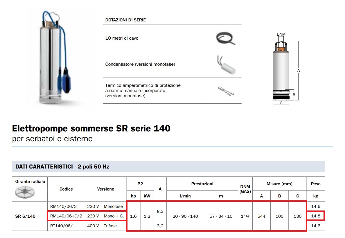 Elettropompe sommerse SR serie 140 monoblocco per serbatoi e cisterne, modello RM140/06+G/2 MONOFASE 230V da 1,6HP.