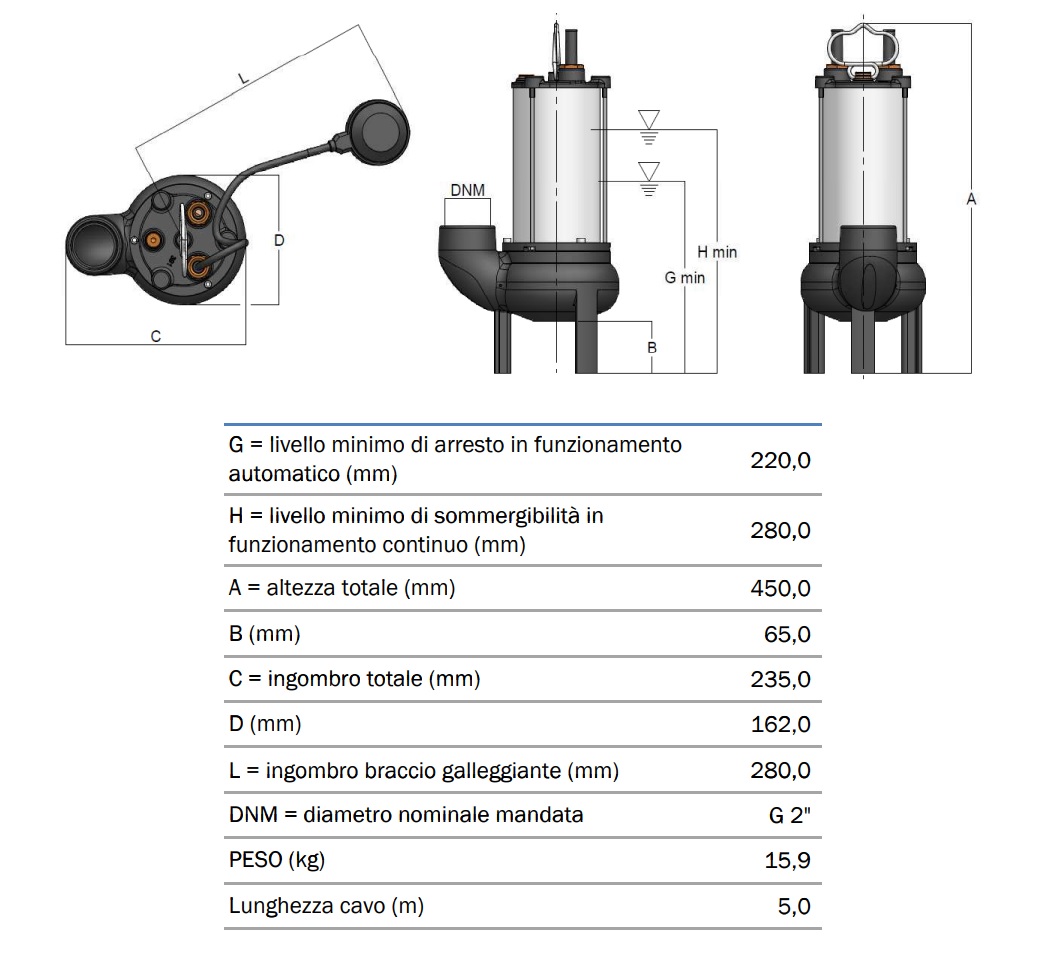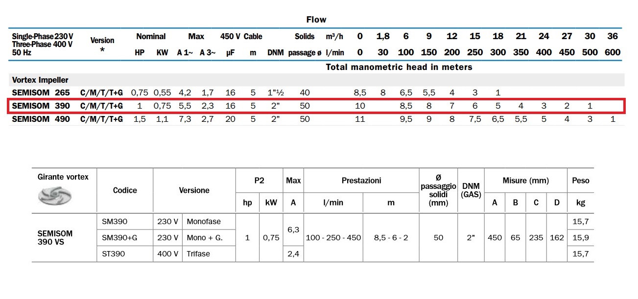 BBC ELETTROPOMPA SOMMERSA SEMISOM 390+G PER ACQUE LURIDE 230V 1HP