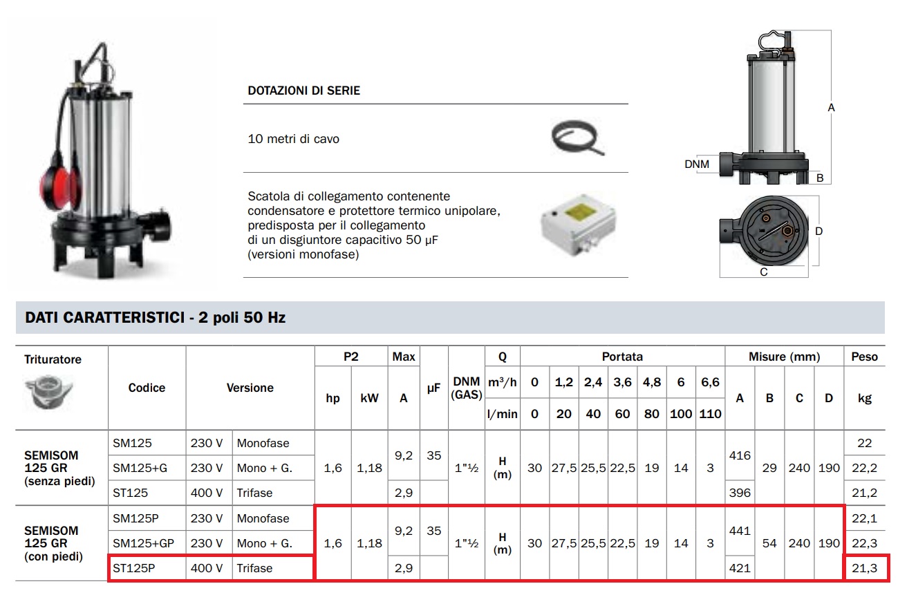 Elettropompa sommergibile TRIFASE SEMISOM ST125P (versione con piedi) con trituratore consigliata per installazione in ambienti domestici, civili e industriali. Dotata di lame in acciaio inossidabile forgiato e temprato, consente la triturazione dei corpi solidi o filamentosi contenuti nelle acque di scarico o acque fognarie permettendone il pompaggio anche in tubazioni di diametro ridotto e dove si richiedono prevalenze considerevoli.