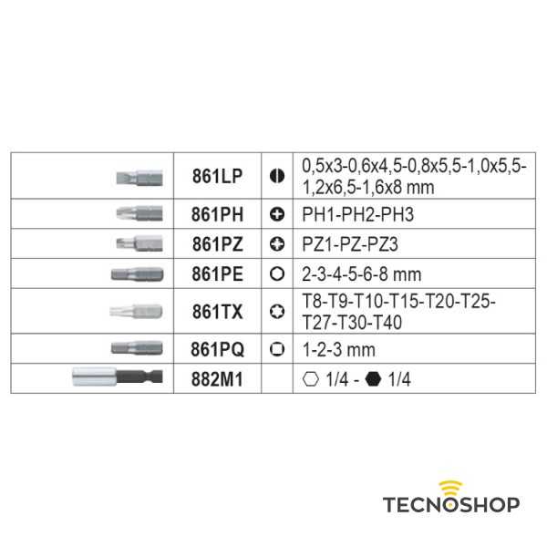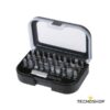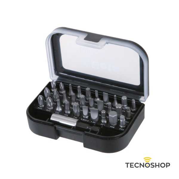 Cassetta portainserti, con 31 pezzi: 1 supporto magnetico + 30 punte (a testa piatta, Phillips, Pozidriv, Hex, Torx e quadrate).