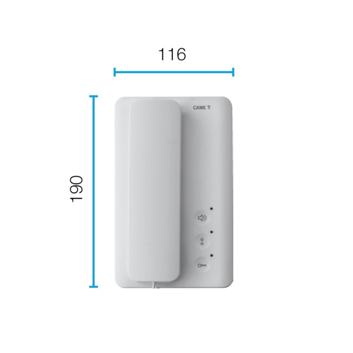 Citofono a cornetta 840CA-0040 di Came con tasti soft-touch, 1 tasto AUX programmabile e colore bianco. Dotato di tasto per la regolazione/esclusione della suoneria.Citofono a parete caratterizzato da 3 tasti soft-touch principali che permettono l’apertura porta, un comando ausiliario programmabile e la regolazione/esclusione suoneria (con LED di segnalazione quando esclusa). Consente la gestione della funzione “apri-cancello” e la visualizzazione dello stato del varco controllato tramite LED di segnalazione. Predisposto per l’installazione a parete su scatola 503 (orizzontale e verticale) e su scatola tonda ร 60 mm. Compatibile con sistema X1 e XIP.
