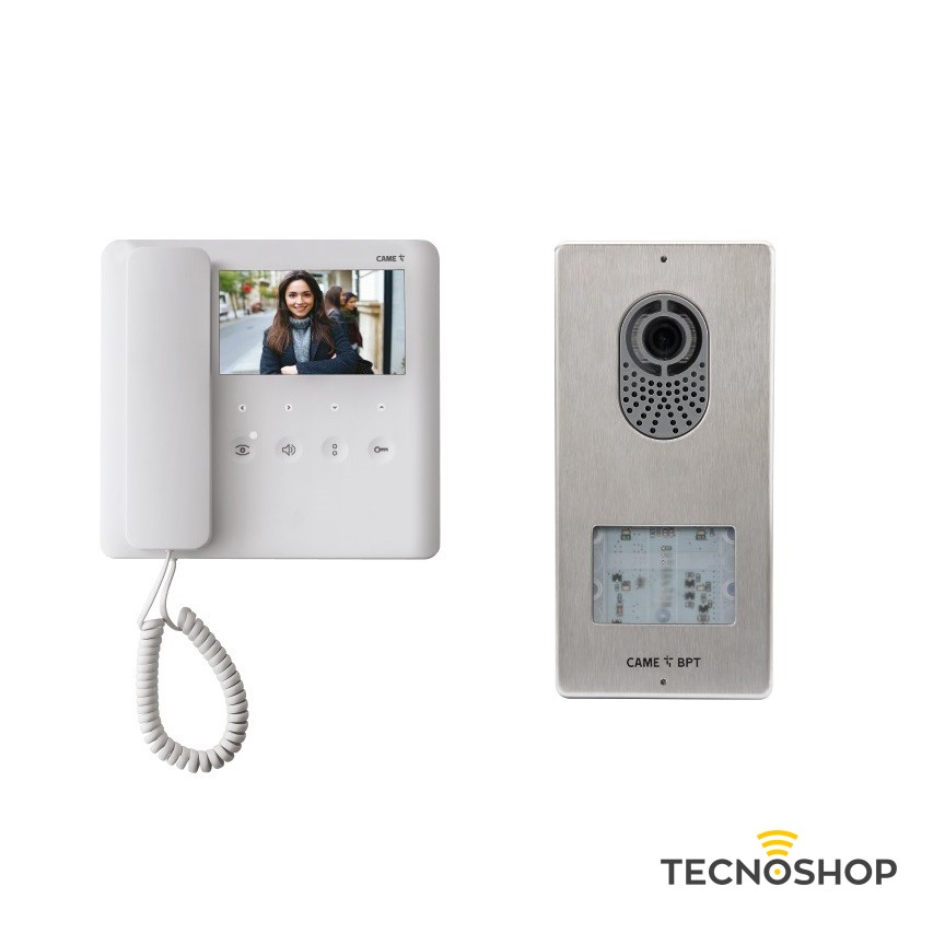 Kit videocitofonico monofamiliare 8K40CF-019, espandibile fino a 4 chiamate, composto da videocitofono AGT (840CF-0020), targa esterna LITHOS e alimentatore VAS/101.