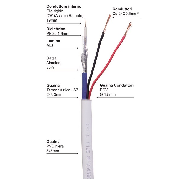 Il cavo è composto da un’anima rigida interna in acciaio ramato conducente il segnale, da un dielettrico che garantisce l’isolamento tra il centro del conduttore e due schermature in alluminio che aiutano a bloccare le interferenze. Esternamente è ricoperto con una guaina in PVC bianco flessibile, per un’agevole posa in opera.