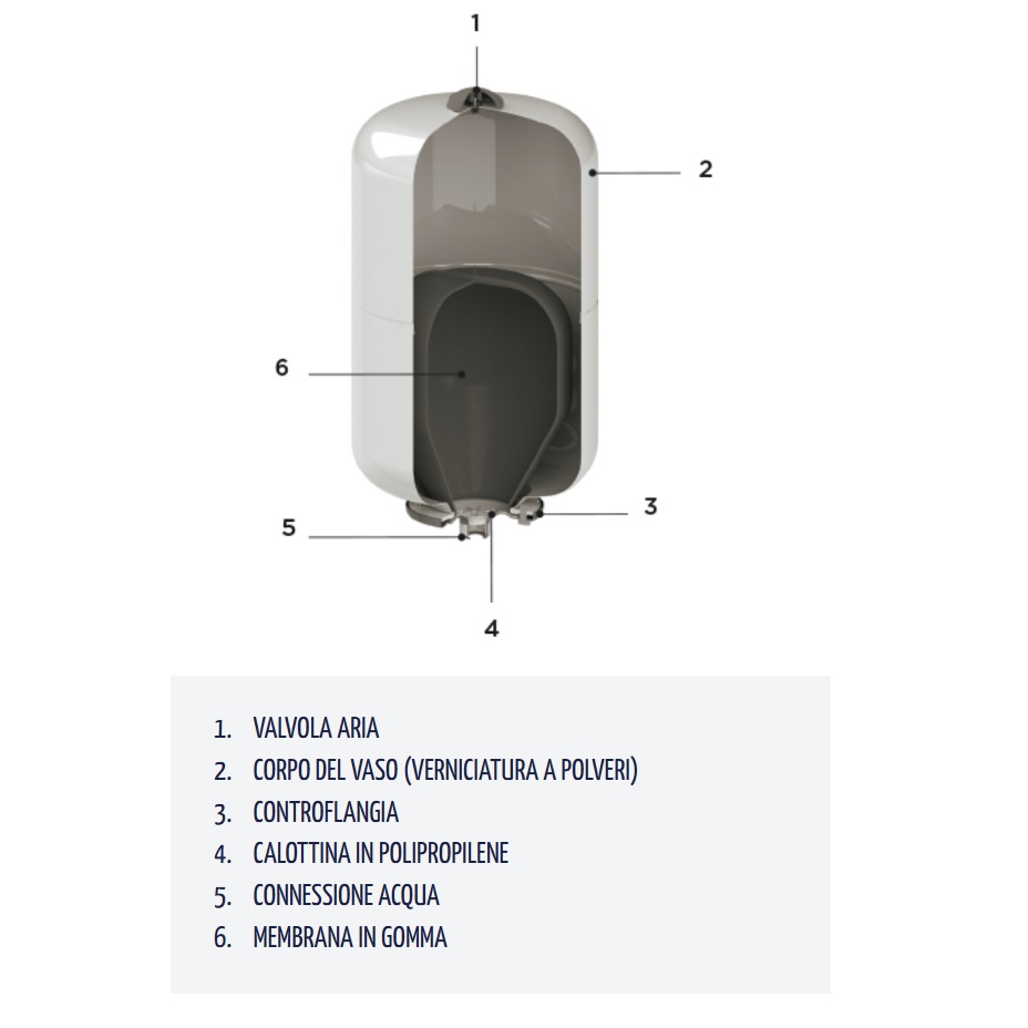 - Serbatoio a pressione con membrana intercambiabile per circuiti acqua calda e fredda sanitaria, sistemi di pressurizzazione, circuiti e impianti di riscaldamento e refrigerazione