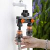 Una presa unica per collegare due programmatori o altri dispositivi a un unico rubinetto, regolando il flusso dโacqua indipendentemente su ciascuna via.