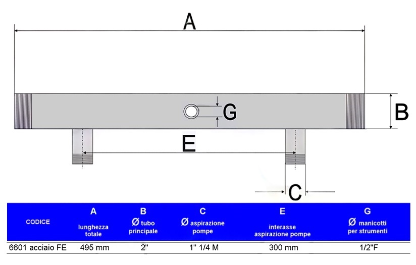 Dotato di tubo principale da 2” e connessioni da 1”1/4 per le pompe, garantisce robustezza, affidabilità e lunga durata nel tempo.