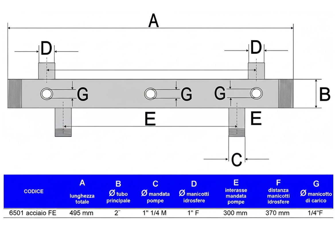 Le prese supplementari da 1” e la predisposizione per manometro e pressostati permettono un controllo completo dell’impianto. Robusto e affidabile, offre facilità di installazione grazie all’interasse di 300 mm e alla lunghezza di 495 mm.