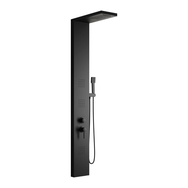 Colonna doccia modello Sirio in acciaio inox nero opaco, dal design moderno ed elegante, completa di doccetta, flessibile e getti orizzontali massaggio per un’esperienza di benessere completa.