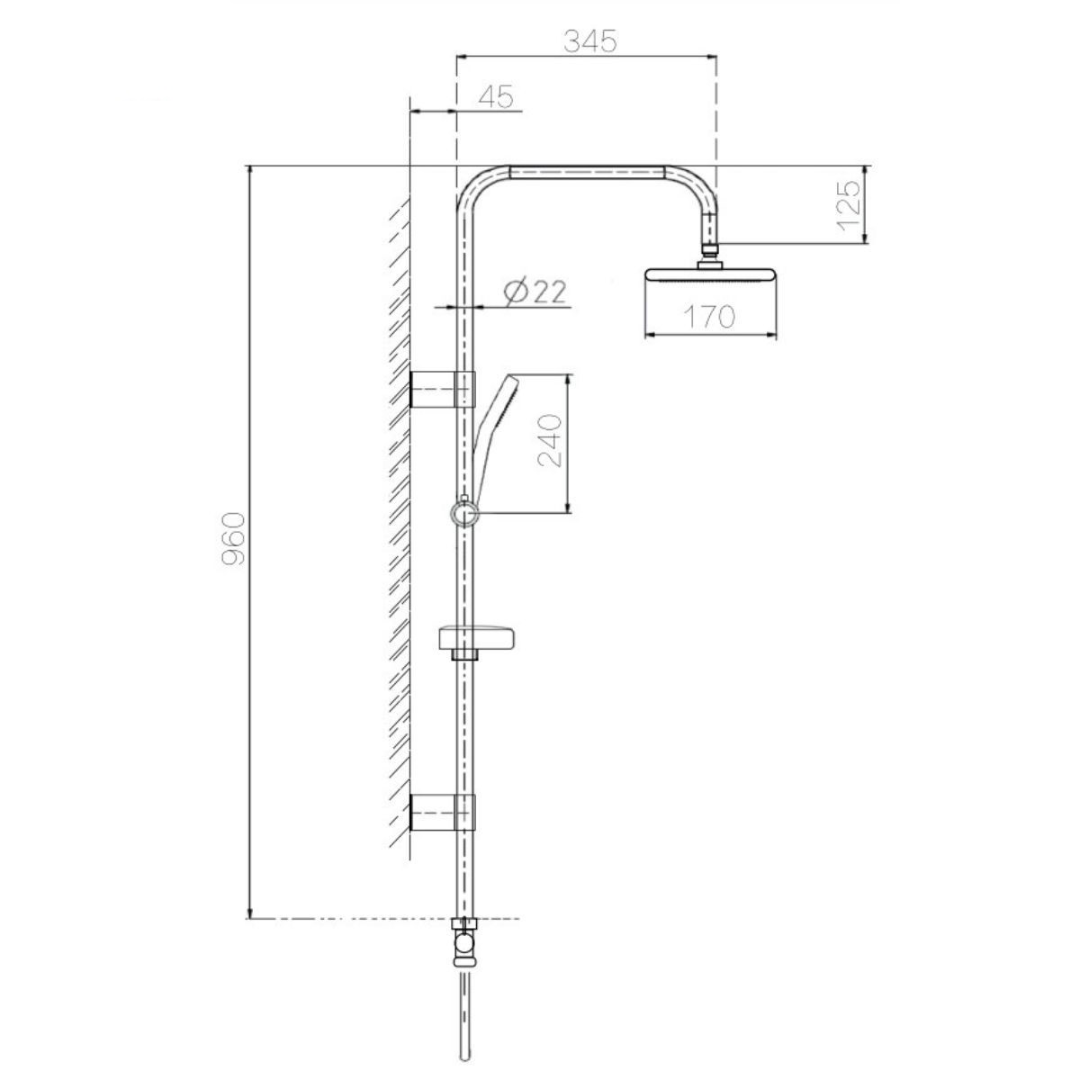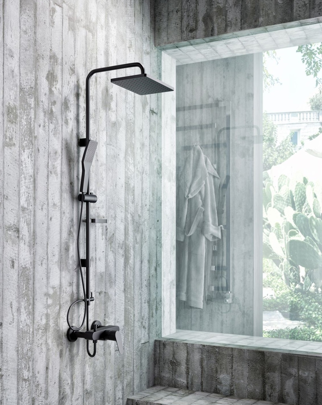 Colonna doccia del brand Ambra serie Roof in acciaio nero opaco realizzata in acciaio con asta da 22mm squadrata con supporti in Abs nero opaco. La colonna è provvista di doccetta monogetto in Abs nero opaco, soffione rettangolare in acciaio delle dimensioni di 25x17cm con ugelli anticalcare. La lunghezza del braccio per il soffione è invece di 24cm. La colonna è provvistaanche di supporto doccino e porta sapone in Abs nero opaco. La confezione comprende 2 flessibili in acciaio con doppia aggraffatura da 150 cm e 60 cm dotati di attacchi in ottone nero opaco.