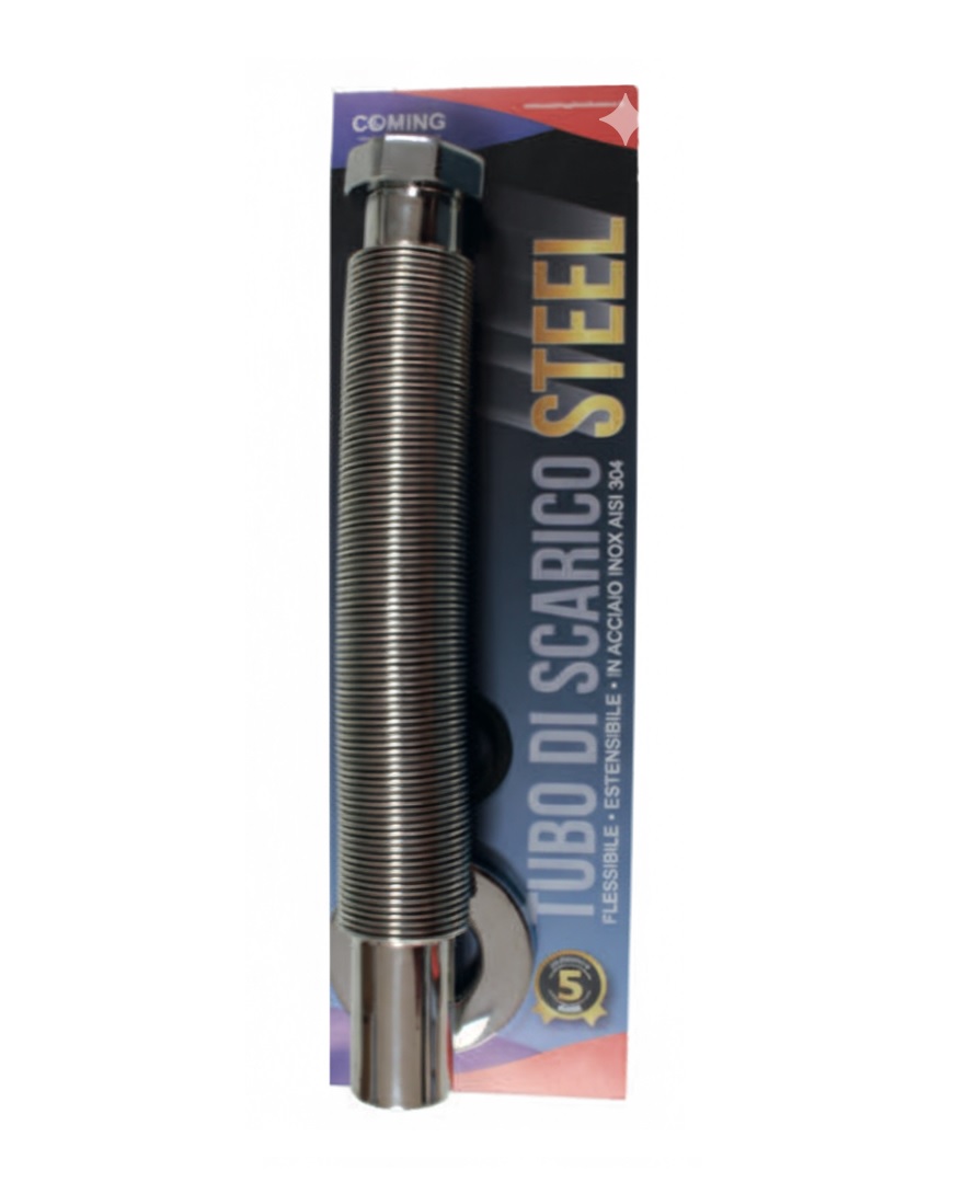 Flessibile estensibile in acciaio inox AISI 304 con ghiera da 1”1/4 in ottone cromato e guarnizione con bordo di sicurezza in NBR. Dotato di rosone in acciaio, garantisce portata a passaggio totale ed elevata resistenza alle temperature (-30°C / +90°C). Ideale per installazione esterna su lavabo, bidet e lavello. Estensibile da 300 a 450 mm con finitura acciaio lucido.