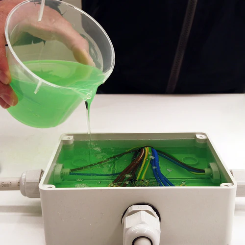 I due componenti, dopo la colata, si polimerizzano rapidamente garantendo un ottimo isolamento dei contatti elettrici anche in immersioni prolungate. La bassa viscosità del gel permette di inglobare completamente i giunti mentre, lo stato finale morbido ne consente la riaccessibilità ed eventuale rimozione.