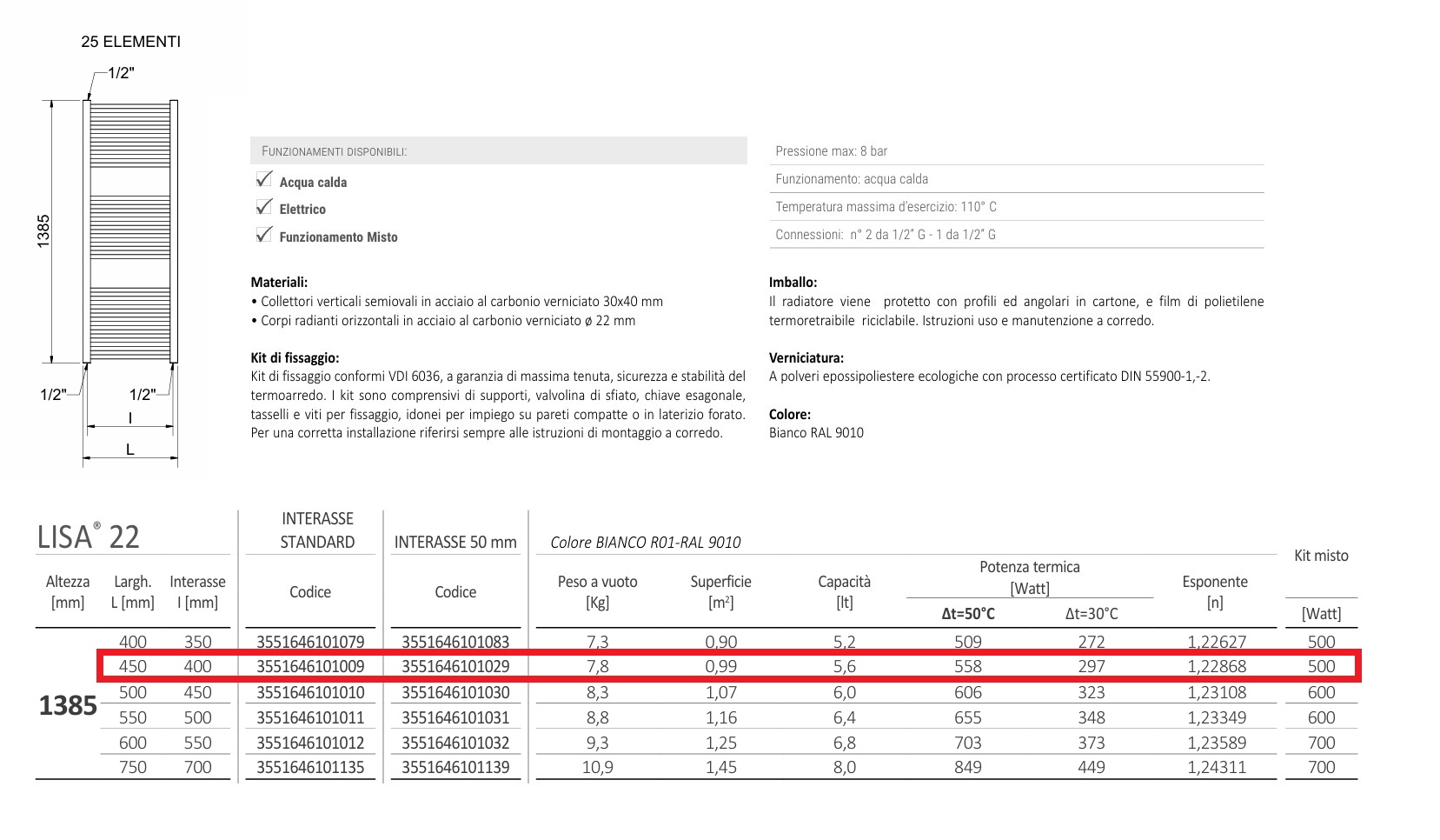CORDIVARI SCALDASALVIETTE LISA 22 BIANCO 1385×450mm INTERASSE 400 mm