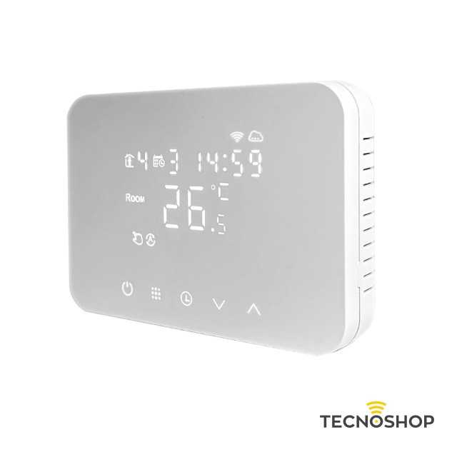 Cronotermostato HEYTERMO+ Smart WI-FI con pannello soft-touch bianco retro illuminato. Programmazione settimanale per il comando di impianti di riscaldamento o raffreddamento( funzione cooling). Richiede alimentazione diretta a 230V; permette di regolare e programmare la temperatura sia in locale tramite pannelo soft-touch che in remoto tramite App HeySmart per smartphone. Include la funzione antigelo e vacanza. Installabile direttamente su scatola 503.