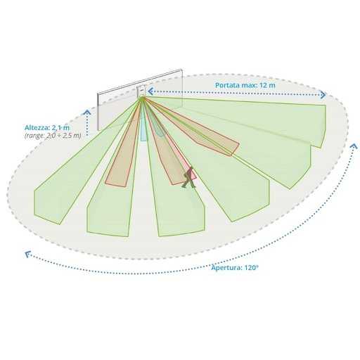 - Rilevazione: doppia tecnologia (infrarosso digitale e microonda 24 GHz), portata fino a 12 m e ampiezza fino a 120°
