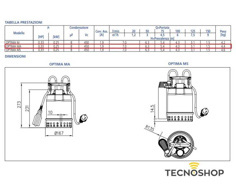 Pompa sommergibile in acciaio inox AISI 304 con tenuta meccanica in bagno d’olio e camera d’olio maggiorata. Queste caratteristiche rendono la pompa affidabile, duratura e resistente alla corrosione. L’elettropompa OPTIMA presenta una grande versatilità di installazione (fissa oppure mobile) dovuta alla possibilità di scelta fra il galleggiante magnetico verticale (di ingombro ridotto) o l’interruttore a galleggiante.