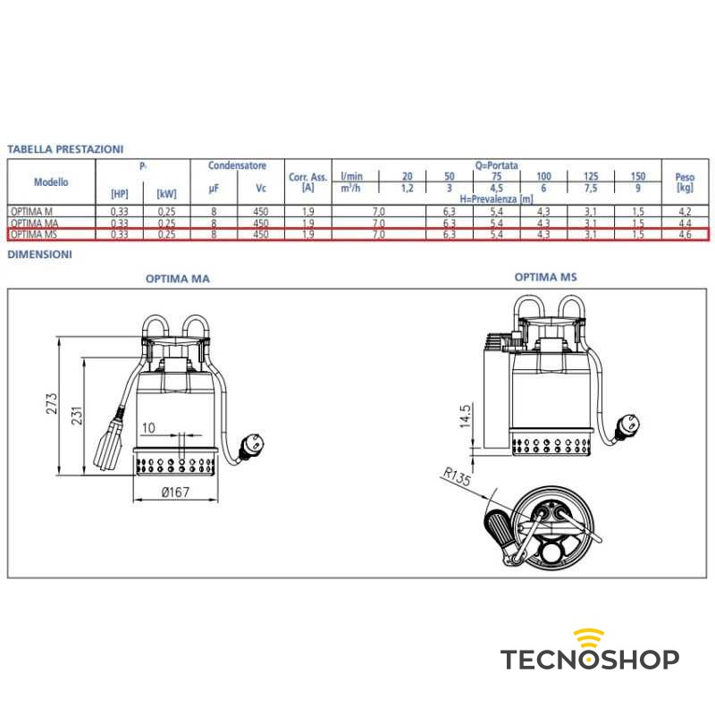 Pompa sommergibile in acciaio inox AISI 304 con tenuta meccanica in bagno d’olio e camera d’olio maggiorata. Queste caratteristiche rendono la pompa affidabile, duratura e resistente alla corrosione. L’elettropompa OPTIMA presenta una grande versatilità di installazione (fissa oppure mobile) dovuta alla possibilità di scelta fra il galleggiante magnetico verticale (di ingombro ridotto) o l’interruttore a galleggiante.