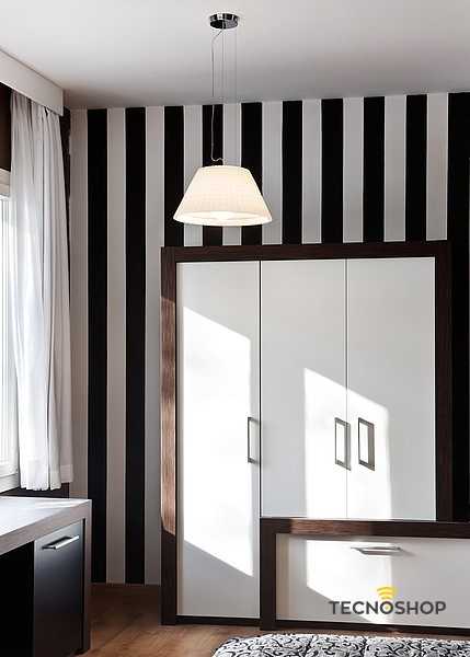 Fabbian Lampadario a sospensione con attacco lampada E27 dispone di un corpo diffusore in vetro pressato verniciato dal diametro di 450 mm. Il corpo portante è realizzato in metallo cromato lucido.
