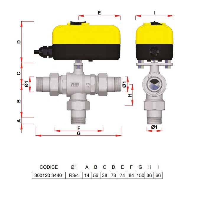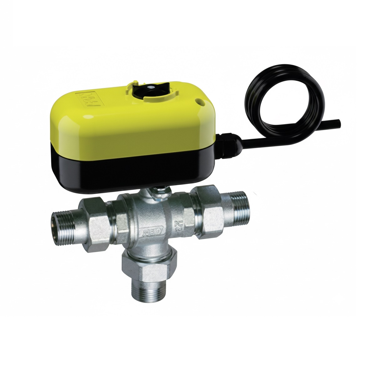 Valvola di zona deviatrice a 3 vie cromata a sfera completa di codoli, calotte e servocomando elettrico.