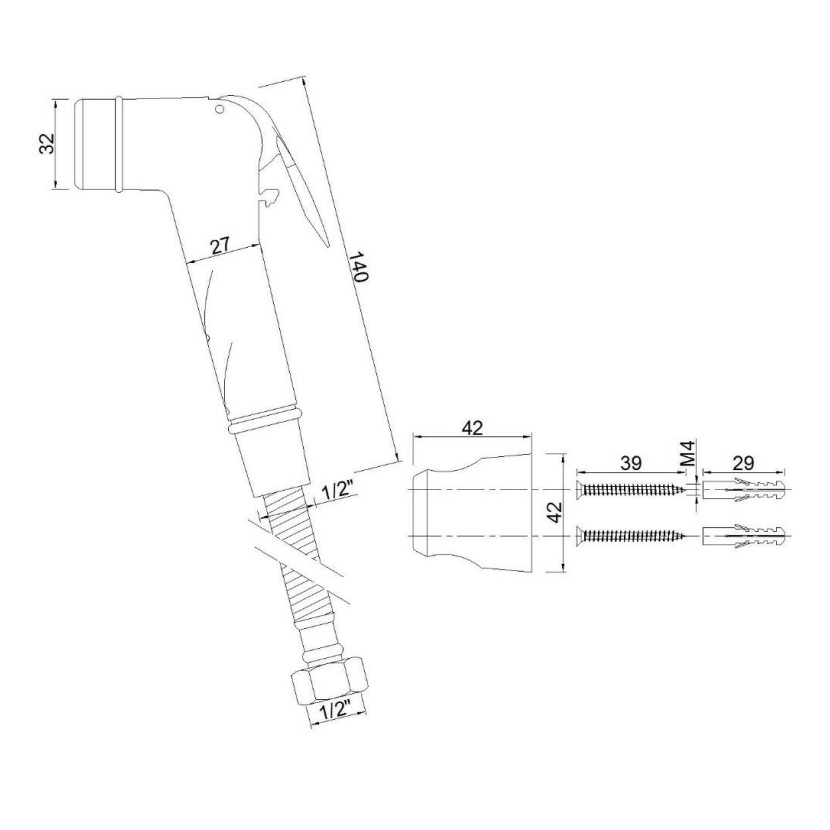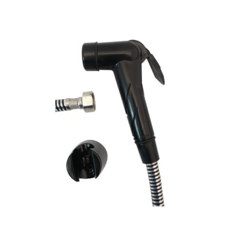 Kit doccia nero con doccetta a pulsante e tubo flessibile, pratico e facile da installare per un controllo immediato del flusso d’acqua.