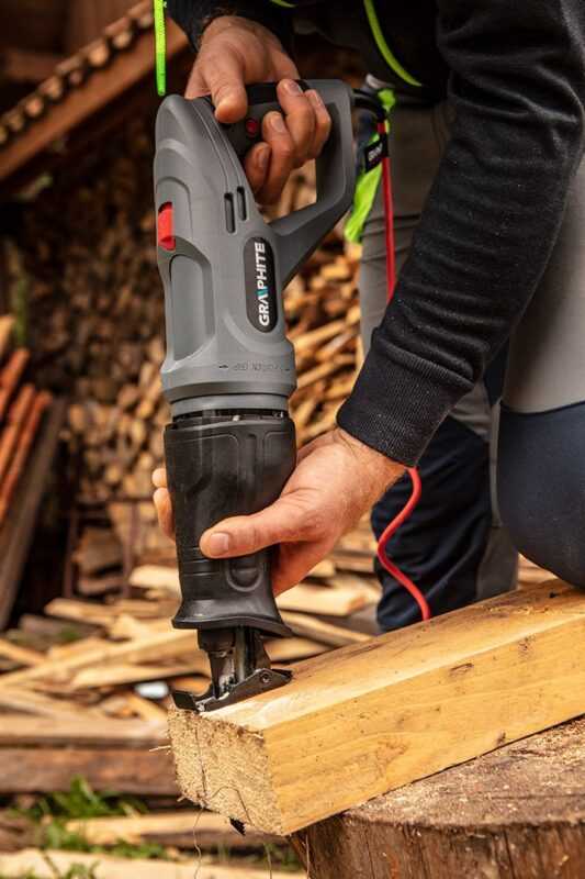 Sega alternativa GRAPHITE, compatibile con batterie Li-Ion GRAPHITE Energy+ da 18 V, progettata per il taglio di legno, metallo e plastica. La sega è dotata di un portautensili a due posizioni adatto per la sostituzione rapida e senza attrezzi della lama. La velocità di avanzamento della lama è regolata dal grado di pressione sul pulsante dell’interruttore. L’interruttore è protetto contro l’azionamento accidentale. L’elevata durata del mandrino consente di lavorare con carichi pesanti. La sega è dotata di un piede di supporto mobile che consente di modificare l’angolo di attacco della lama. Per sicurezza e comodità , la maniglia è stata ricoperta con materiale antiscivolo.