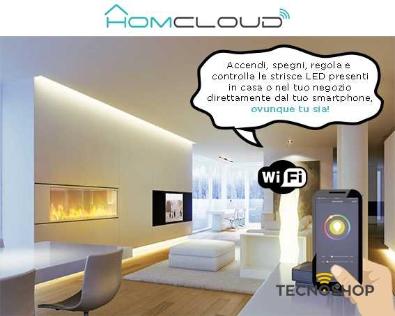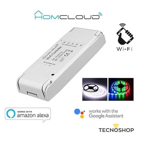 Il controller wi-fi per strisce Led RGBCW nasce per controllare da remoto tutti i tipi di strisce led (RGB, mono colore e bi-colore o RGB + bianco caldo e freddo) tramite l’app di Homcloud sul proprio smartphone.