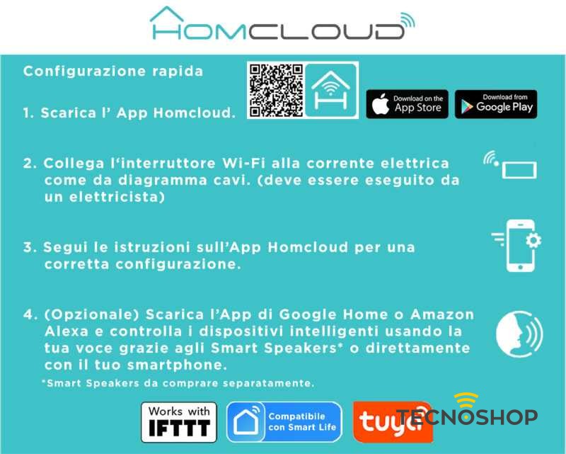 Compatibile con Amazon Alexa e Google Home. App di controllo Homcloud scaricabile gratuitamente da App Store o Google Play (compatibile anche con App Smart Life).