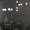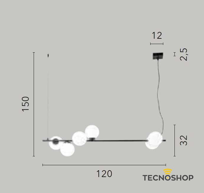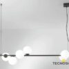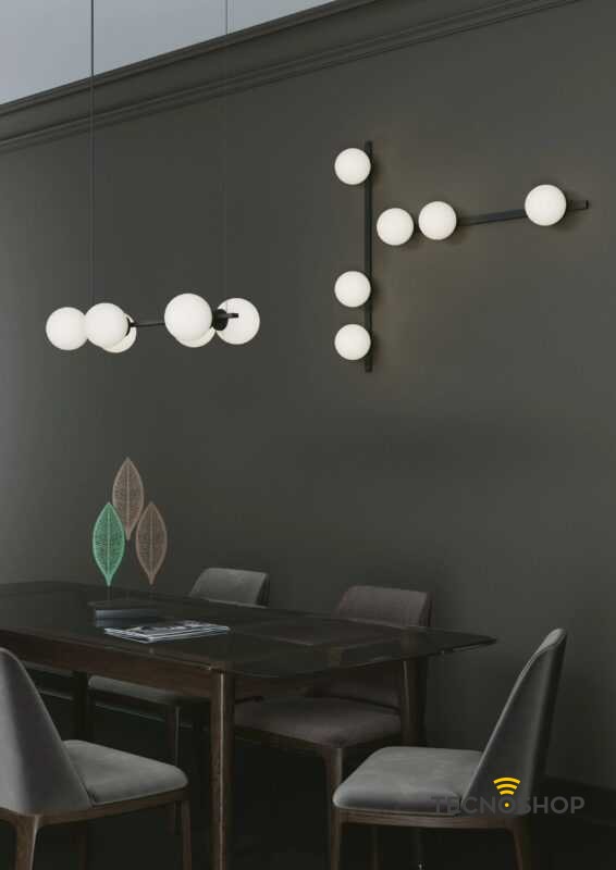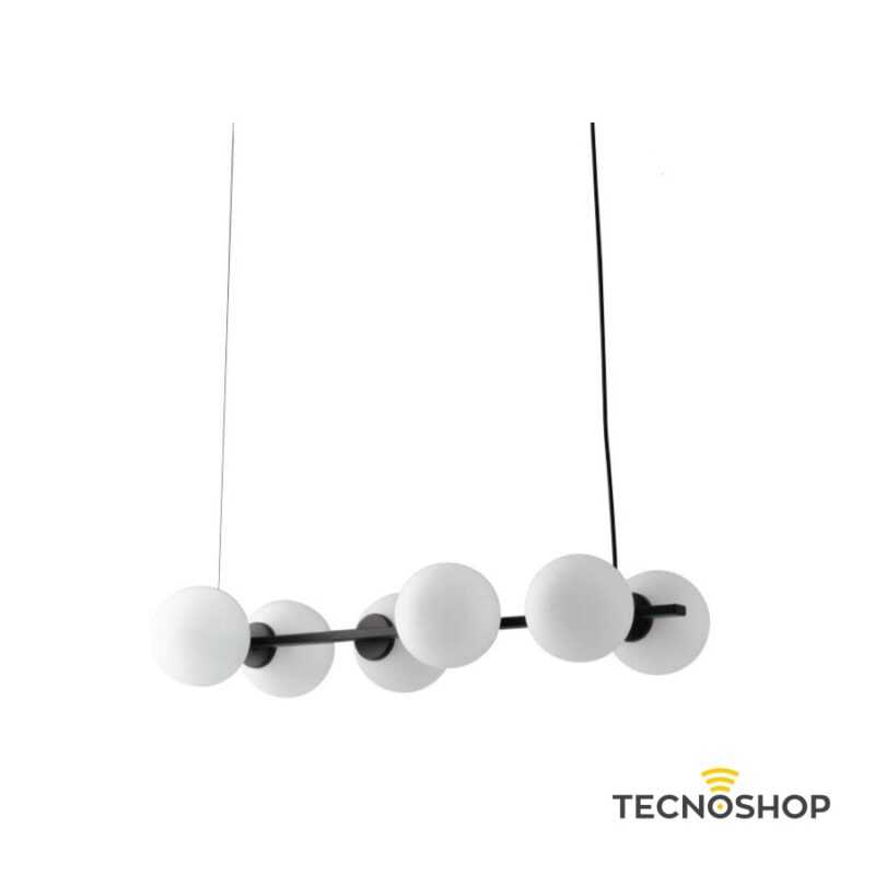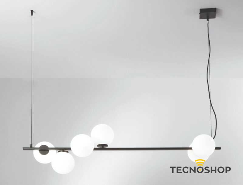 La sospensione della serie ENOIRE é realizzata con struttura lineare in metallo nero opaco e 6 diffusori sferici in vetro bianco satinato. Un lampadario dalle linee nette e decise con un design inconfondibile, consigliato per illuminare ambienti in stile contemporaneo o moderno come soggiorno o sala da pranzo.