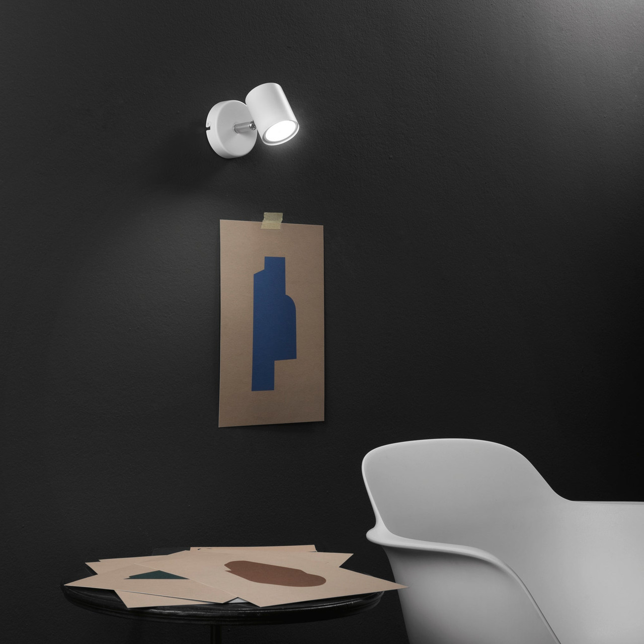 Spot in metallo con punti luce orientabili, disponibili nelle versioni Nero o bianco opaco. Forme modulari disponibili: singolo, doppio su staffa lineare, triplo con base rotonda, quadruplo su staffa lineare.