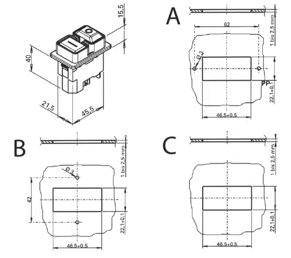 | Ritaglio del pannello | 46,5 × 22,2 mm |