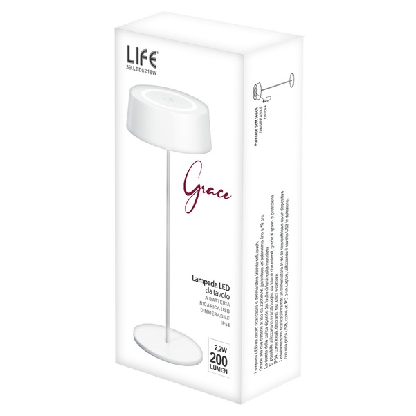Lampada LED da tavolo ricaricabile “Grace”, dal design elegante e moderno, ideale per ambienti interni. Dotata di alimentazione tramite cavo USB e batteria integrata (2×2000 mAh), garantisce praticità e autonomia.