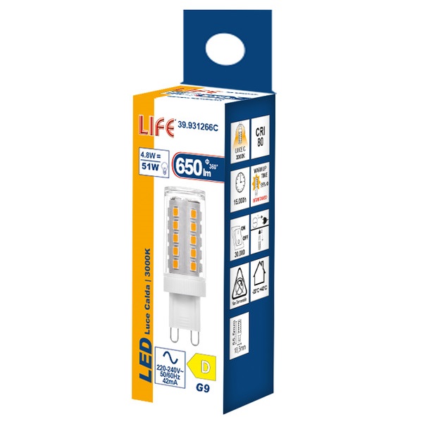 Lampada LED G9 da 7W, potente e ad alta resa luminosa, ideale per illuminare efficacemente ambienti domestici e professionali. Emette una luce calda da 3000K con un flusso luminoso di 650 lumen e un’ampia diffusione a 300°, garantendo un’illuminazione uniforme.