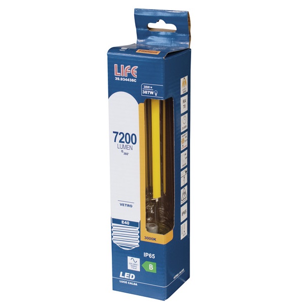 Con un consumo di 38W offre un’elevata luminosità di 7200 lumen, con luce bianco caldo 3000K e ampio angolo di diffusione a 320°. Funziona a 220V, garantisce una resa cromatica CRI70 e dimensioni (46×207 mm), con classe energetica B.