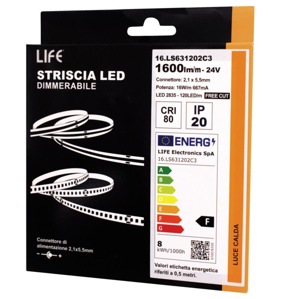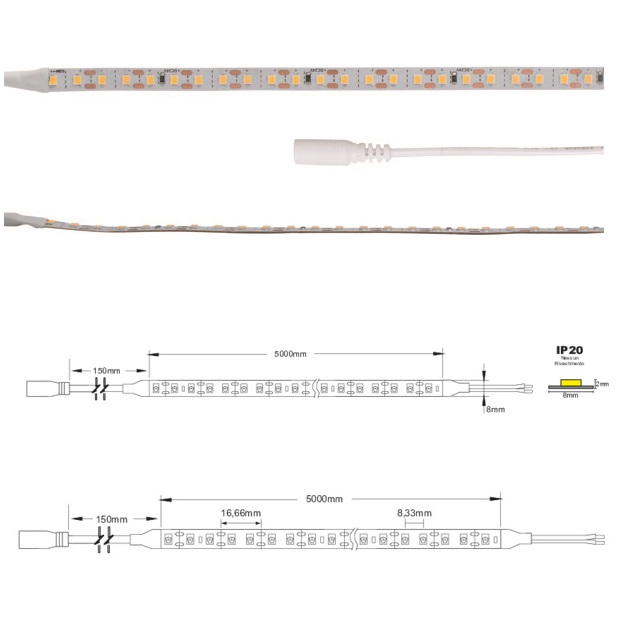 Funziona a 24V con un consumo di 16 W/m, ha CRI80 per una buona resa cromatica ed è dotata di PCB da 8 mm. Con grado di protezione IP20, è ideale per illuminazione interna, profili in alluminio, mobili e applicazioni decorative.
