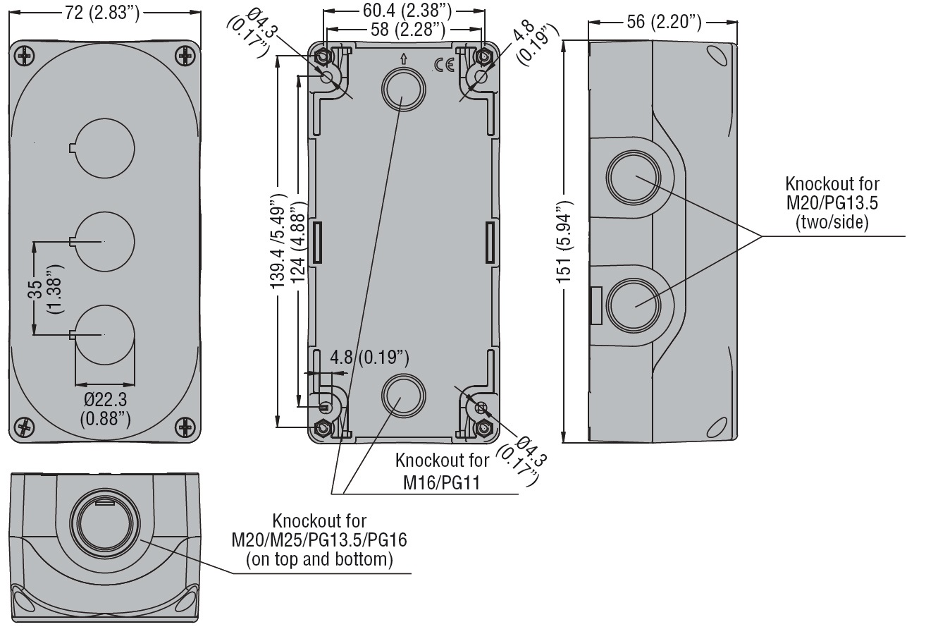 Pulsantiera Lovato, senza operatori, per 3 operatori. Coperchio grigio.