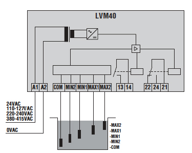 Relè di livello LVM40A024, esecuzione modulare, monotensione. Funzioni multiple. Ripristino automatico, 24VAC