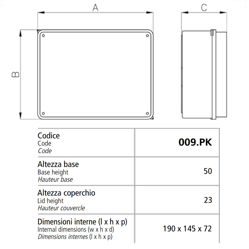 - Dimensioni: 190 x 145 x 72 mm