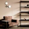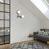 Lampada a parete modello LINGOTTO in metallo nero, con particolari oro spazzolato e oro-rosa. Vetri soffiati opalino forma arrotondata.