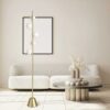 Lampada da terra modello Pomì a 5 luci in vetro bianco latte. Montatura oro spazzolato.