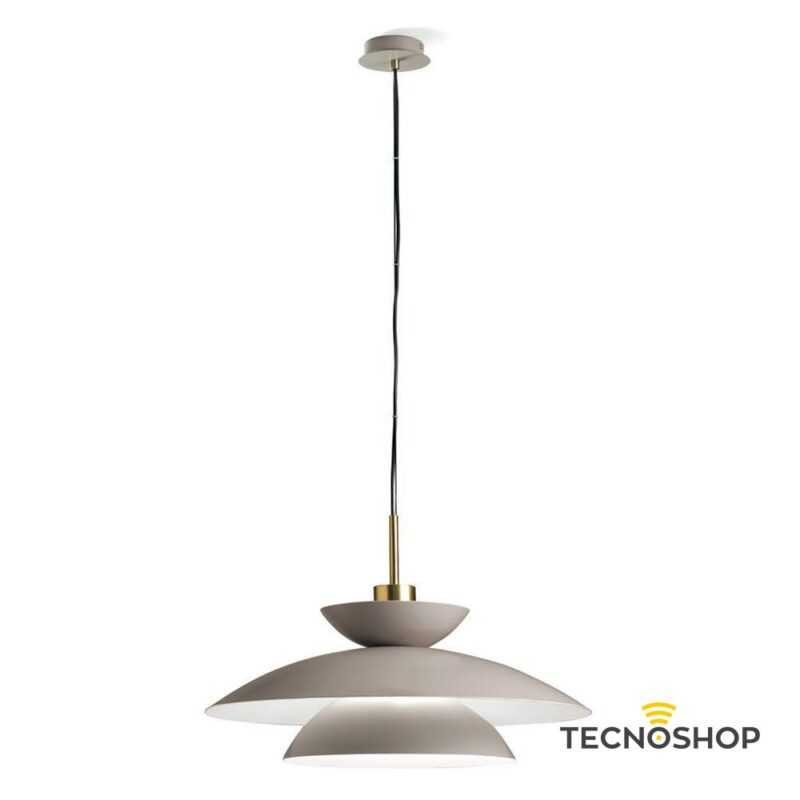 Lampada a sospensione in metallo verniciato tortora e montatura ottone spazzolato. Cavo di alimentazione nero 200 cm. Rosone tortora.