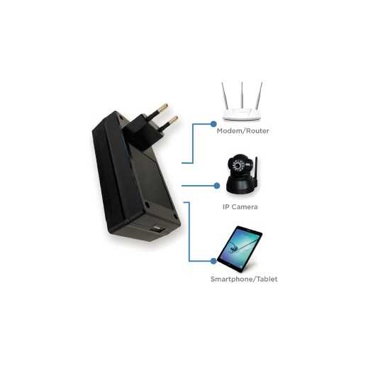 Mini UPS e stabilizzatore di corrente 2 in 1 progettato per fornire alimentazione continua e di emergenza fino a 3 ore per vari dispositivi a corrente continua 5V 2A come camere IP, router, modem , sistemi telefonici VOIP, sistemi di allarme. Può fornire fino a 3 ore di funzionamento in caso di interruzione di corrente.