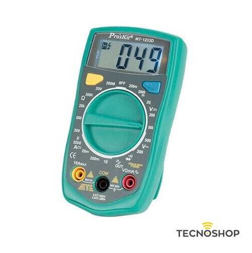 Multimetro tester digitale 3 1/2 cifre conforme CE display retroilluminato. Misurazioni effettuabili: DC, AC, Corrente DC, Resistenza, Temperatura (-40ยฐ 150ยฐC; 150ยฐ 1000ยฐC), continuitร con beeper, test dei diodi.